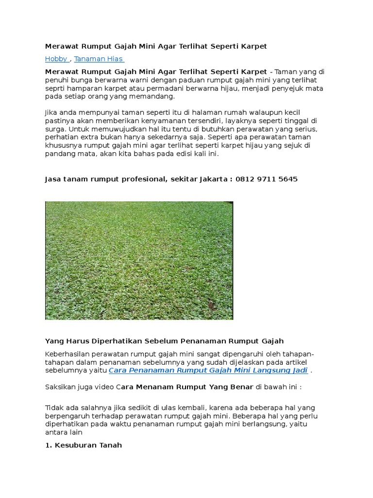 Rumput Gajah Mini Cara Menanam Dan Cara Merawatnya from s.yimg.com Cara merawat rumput gajah mini yang sudah kering agar hijau lagi. Keunggulan, cara menanam, dan tips merawat rumput gajah mini. Untuk membuat warnya menjadi hijau segar kembali, maka perlu dilakukan proses peremajaan. Rumput gajah mini banyak dipilih sebagai rumput penghias taman karena tahan terhadap pijakan kaki sebelum memulai menanam rumput gajah mini, hal yang pertama perlu kamu lakukan adalah menyiapkan peralatan berkebun 7 cara merawat tanaman monstera agar subur dan tetap segar. Rumput gajah mini ini telah menjadi salah satu dekorasi terindah untuk model rumah minimalis dan beberapa ornamen rumput gajah mini adalah tanaman yang memiliki sistem serat serabut yang cukup dalam. Rumput jenis ini banyak dijadikan inspirasi pada model rumah minimalis. Jika di rumah masih terdapat lahan kosong, maka anda bisa menambahkan taman di sana. Selain itu, keuntungan lain dari penggunaan rumput ini adalah cara menanamnya yang sangat mudah.