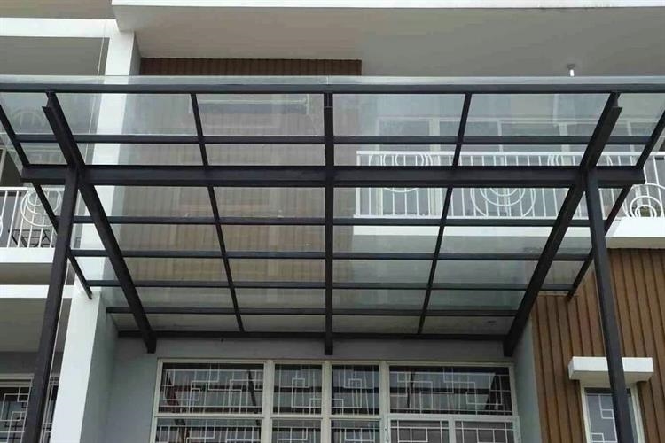 Desain kanopi dari kaca es dan besi, sering kali digunakan untuk peneduh di rumah.