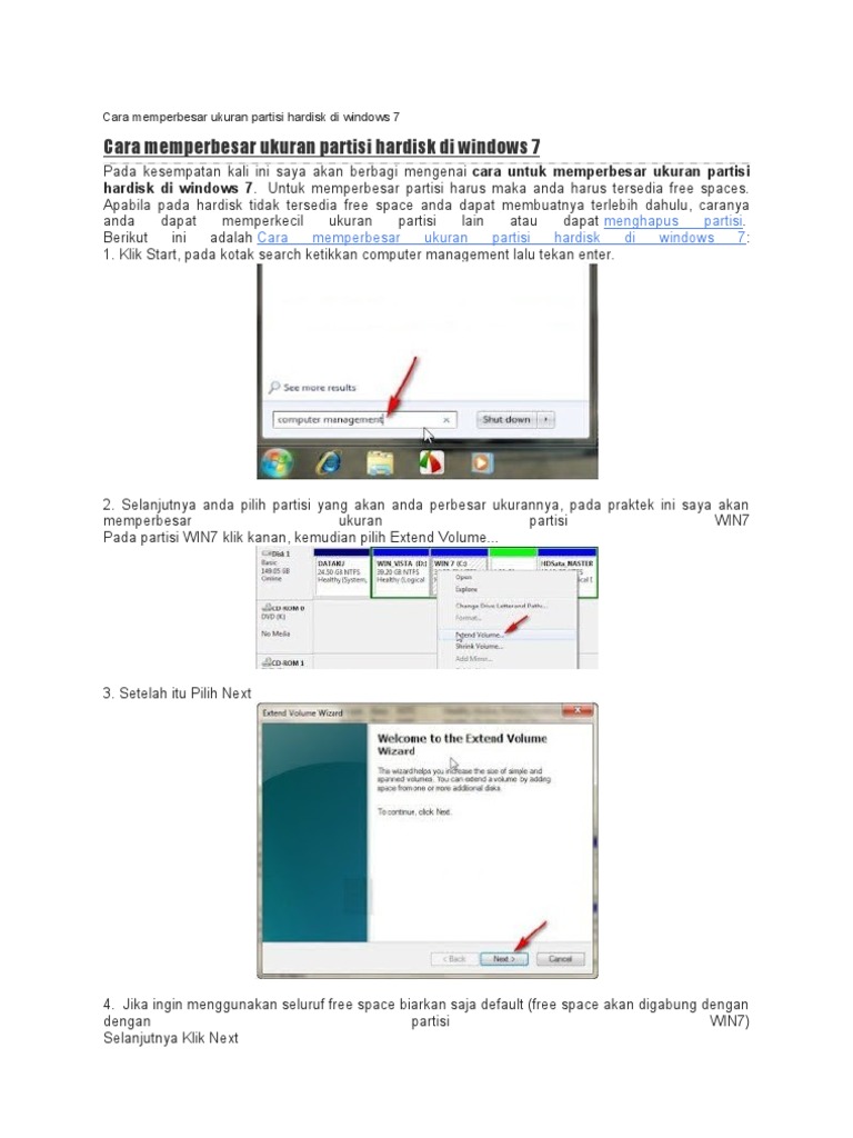 Sehingga jika terjadi sesuatu dengan sistem computer pada partisi c data pada partisi lain kemungkinan besar masih bisa terselamatkan. Di postingan perdana saya ini, saya ingin sekedar berbagi pengalaman mengenai cara menambah volume partisi c: Cara menambah volume partisi (c:) pada windows 7. Pada saat ini istilah partisi sering kita dengar pada bagian dari hardisk. Pada awal format windows 7 ultimate, hardisk saya bagi menjadi tiga partisi yaitu volume label c. Ketika kita membeli hardisk baru atau laptop baru maka hardisk masih belum dipartisi (belum dibagi ruangannya). Salah satu software yang perlu anda coba ketika ingin mempartisi harddisk pada komputer ber os windows 7 adalah minitool partition wizard home edition. Untuk memulai proses instalasi windows 7 pada kompter atau laptop, kita harus mengatur boot awal pada menu bios agar pc pertama kali membaca dvd aturlah partisi sesuai yang dikehendaki. Pada saat diaktifkan, maka aplikasi akan memastikan kembali bahwa partisi akan dihapus dan kita pengguna komputer disarankan untuk melakukan backup data terlebih dahulu. Membagi partisi di windows 7. 1.klik kanan pada my computer 2.klik manage. Ok langsung saja ke tkp. Misalnya, ketika laptop kita d.